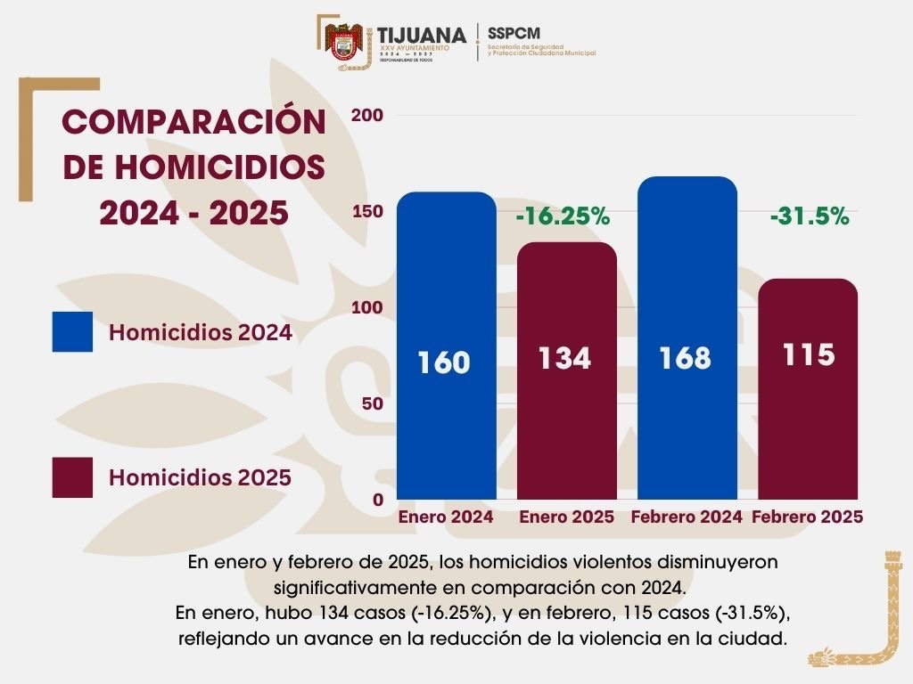 Durante los dos primeros meses del 2025, se registraron un total de 250 homicidios violentos, cifra muy por debajo de las 328 muertes violentas registradas durante el mismo periodo del 2024 en la ciudad de Tijuana.