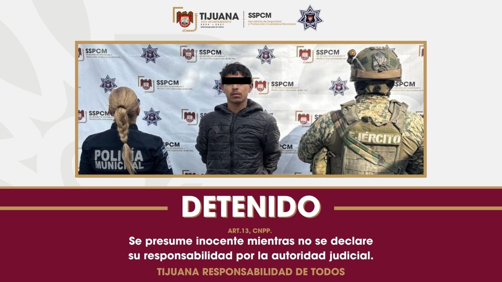 – La Secretaría de Seguridad y Protección Ciudadana Municipal (SSPCM), informa que, como resultado de un operativo preventivo realizado por la Policía Municipal, en coordinación con la Secretaría de la Defensa Nacional (SEDENA), se logró la detención de una persona presuntamente relacionada con diversos delitos, en la colonia Natura, sección Bosques.